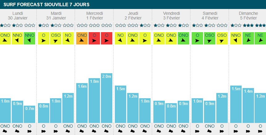 Contrairement à certaines régions, la Charente-Maritime profitera bien de cette arrivée de houle en début/milieu de semaine. Selon les prévisions, 3 jours de bon surf se détachent clairement du reste de la semaine. La journée de mardi proposera des séries jusqu'à 1m60, pour 1m50 mercredi en fin de journée. 1m50 a la série qu'on retrouvera dans l'après-midi de dimanche, avec des vents qui ne dépasseront pas les 15km/h dans la semaine, et qui passeront offshore à partir de samedi.
