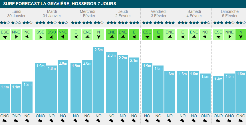 C'est solide dans les Landes cette semaine. Le pattern se répète à nouveau, et verra grossir la houle en milieu de semaine pour atteindre les 2m50 à la série mercredi après-midi. La houle ne fera pas dans la dentelle le reste de la semaine et stagnera aux alentours d'1m60 (excepté lundi, ou la houle culminera à 1m20 à son plus haut pic). un beau vent side/offshore d'une quinzaine de km/h à son max accompagnera vos sessions tout au long de la semaine.