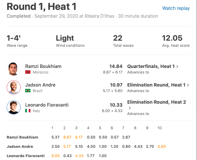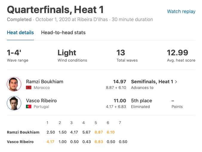 Ramzi Boukhiam continue à dominer et gagne contre le portugais Vasco Ribeiro avec un score final de 14,97 points. Fidèle à sa stratégie, Ramzi a fait preuve de patience pour démontrer son vrai potentiel sur les meilleures vagues de la série.