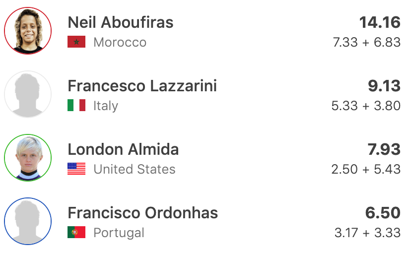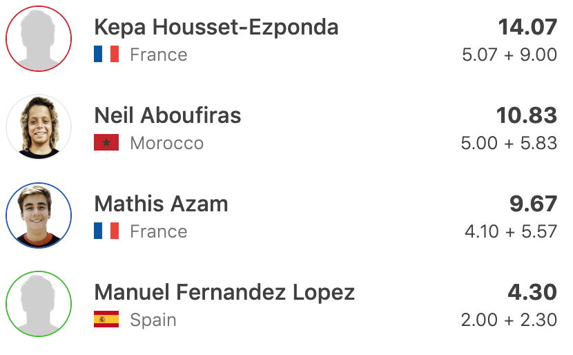 En deuxième round Neil Aboufiras a continué sur sa belle lancée et récupère la deuxième place qualifiante au prochain round. Le jeune Casablancais à fait face aux deux Français Kepa Housset-Ezponda et Mathis Azam ainsi que l'Espagnole Manuel Fernandez Lopez.