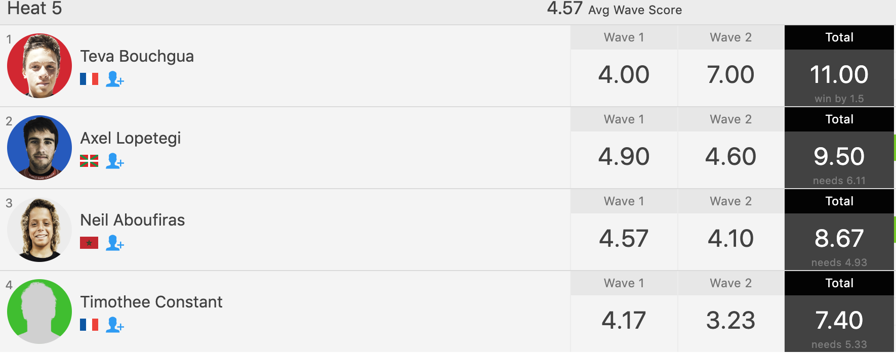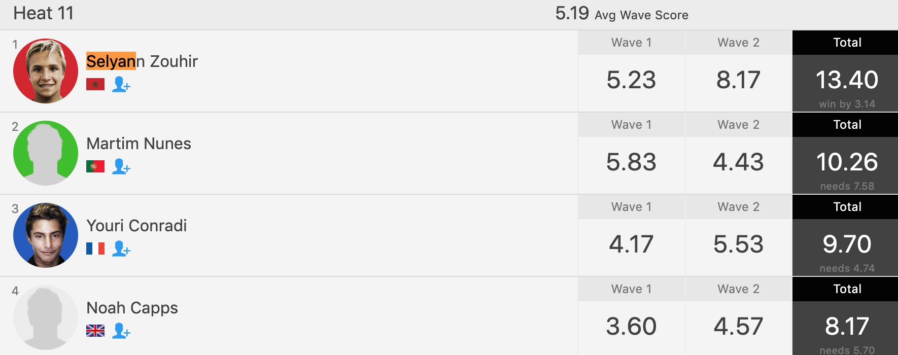 Selyann Zouhir qui démarrait du troisième round (vu son bon classement l'année antécédente) a réalisé un bon départ lors de ce QS en terminant premier de sa série. Selyann assure une première vague à 5.23 avant de scorer une autre vague à 8.23 ... le plus haut score de ce round 3 !