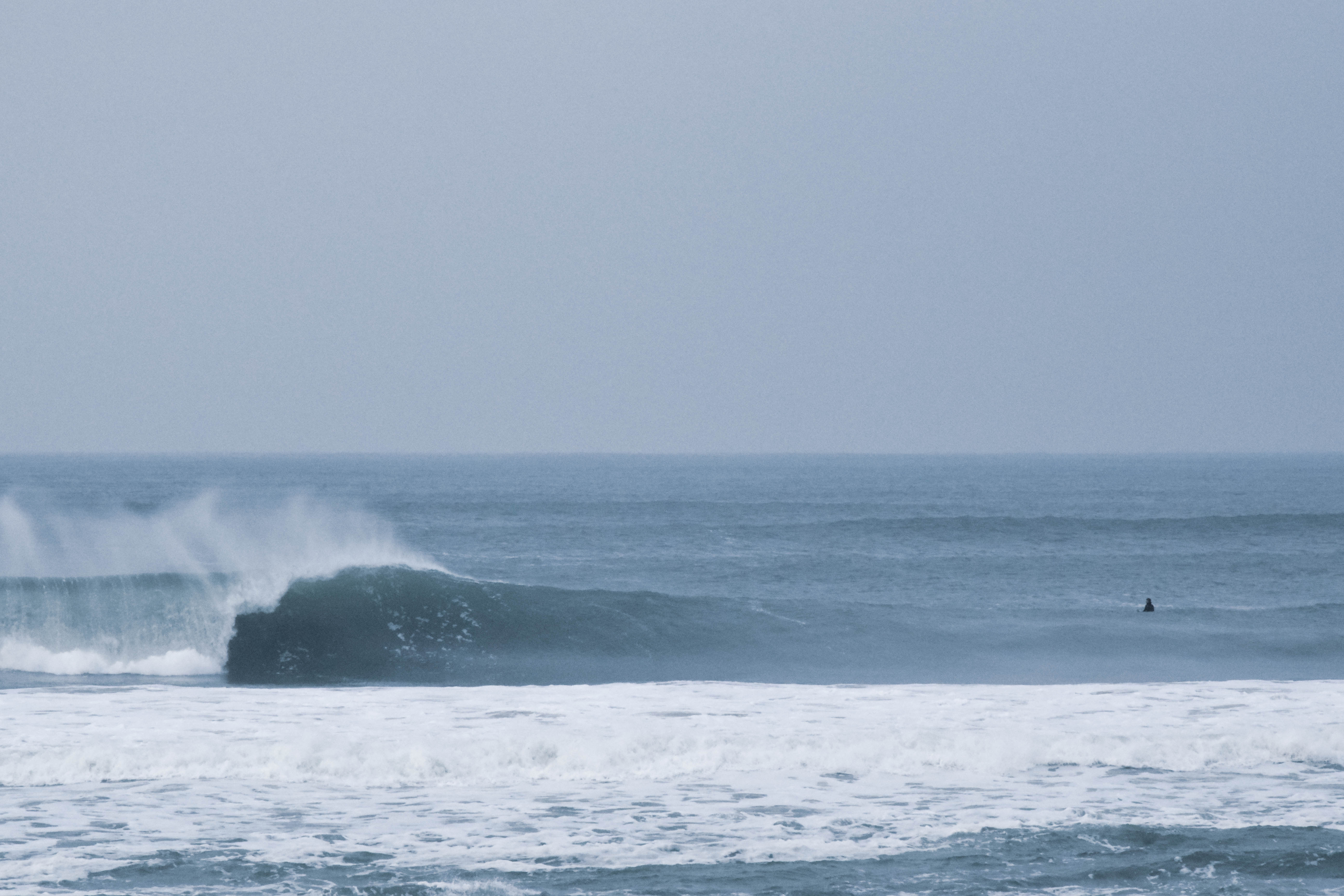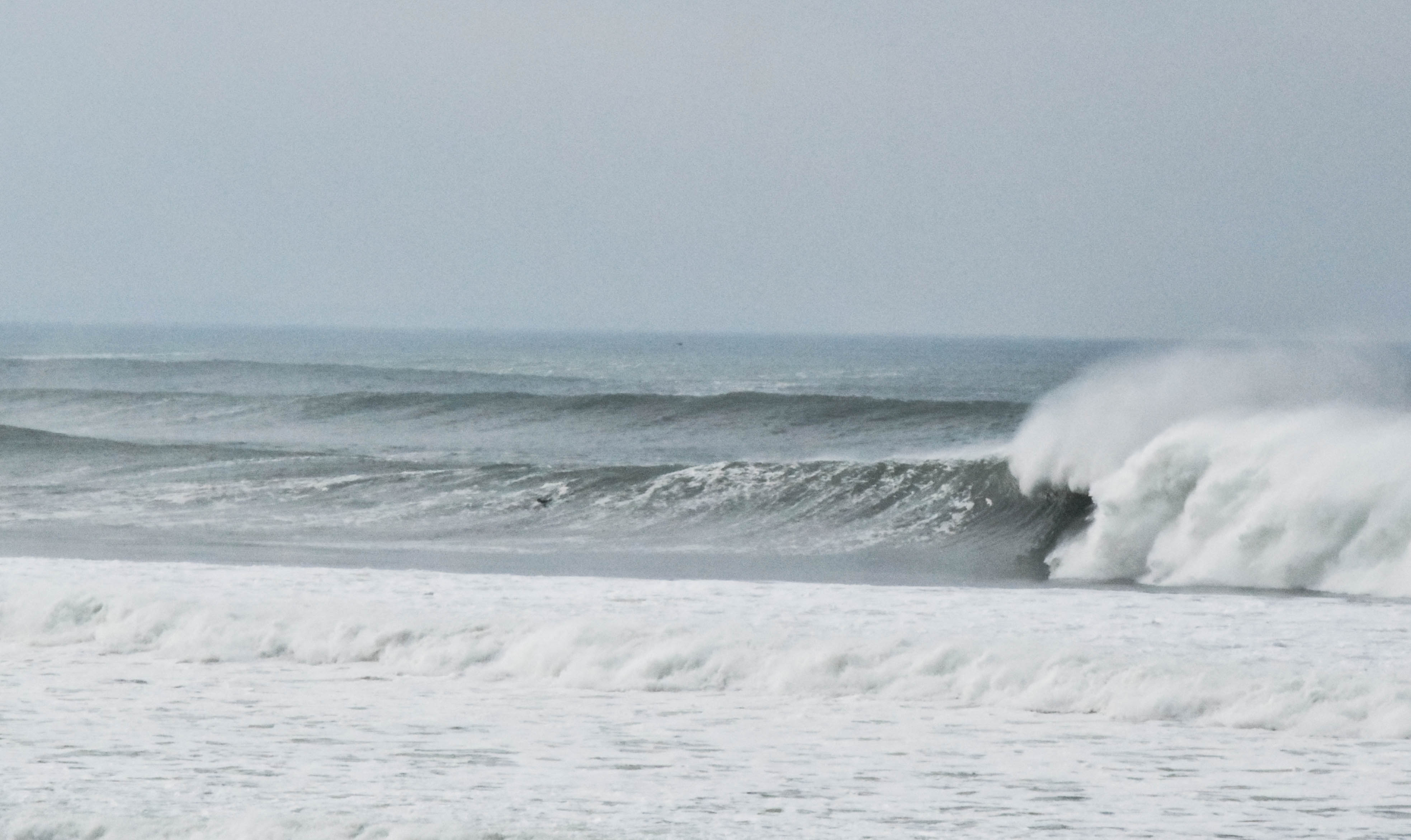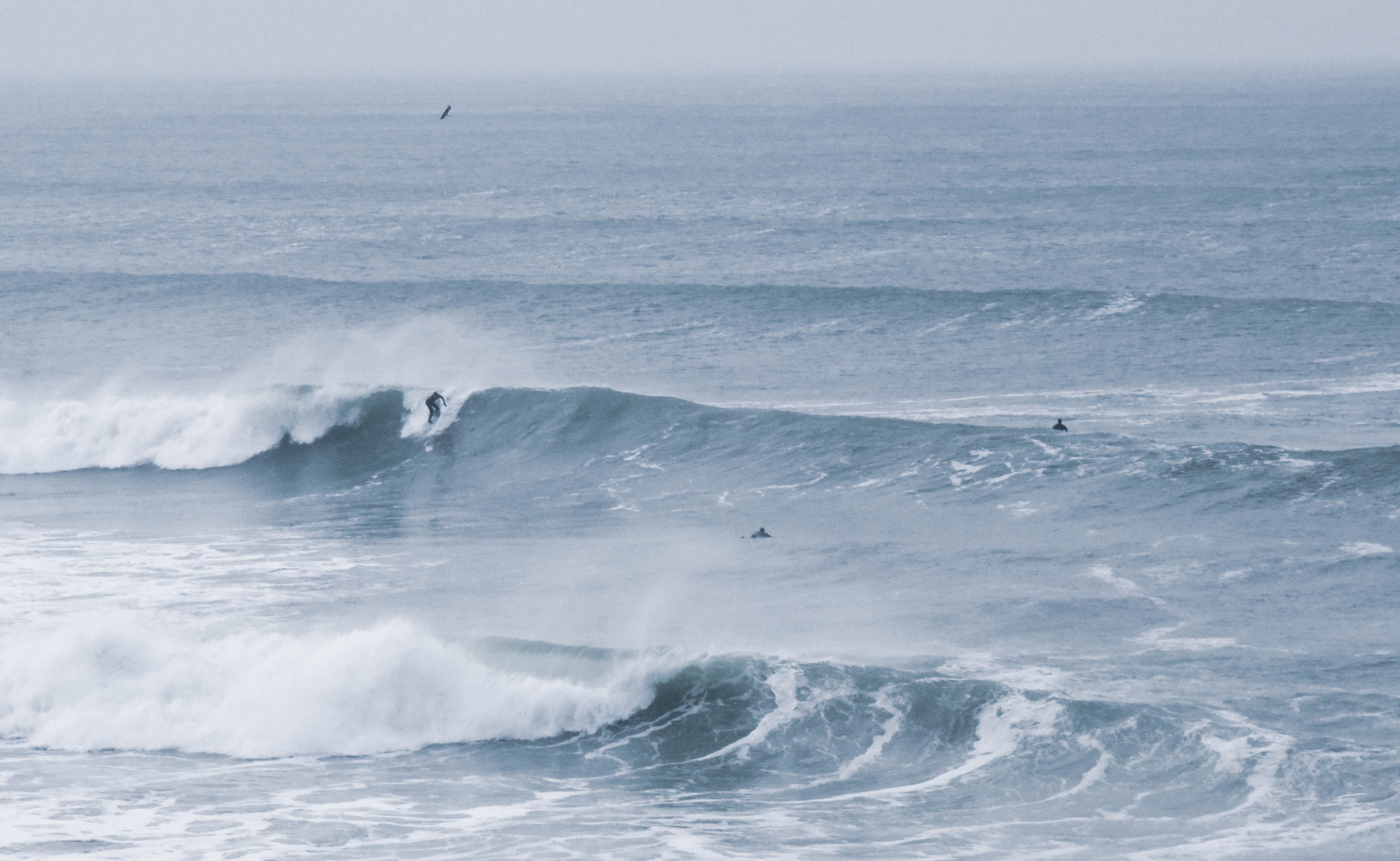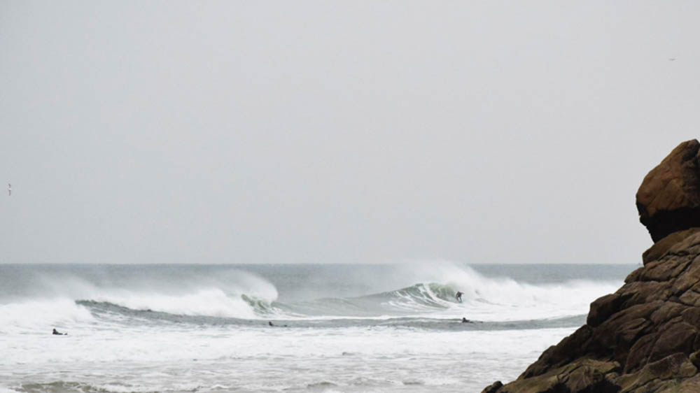 C'est aujourd'hui qu'est annoncée l'une des plus belles journées de surf de la semaine. A 8h45 sur la Presqu'île, quelques vans et breaks sont déjà garés sur les parkings, mais ils ne sont pas si nombreux finalement : le spot a déjà sélectionné les surfeurs du jour. Il faut dire que la houle longue a encore grossi dans la nuit, le vent off-shore d'est à nord-est qui vient coiffer les crêtes s'est nettement renforcé depuis la veille et que le temps hivernal et neigeux a pris possession des lieux. D'ailleurs, la neige commence à tomber à 11h : rien d'exceptionnel cependant, cela ne dure que quelques minutes. Il fait très froid, glacial même avec un ressenti de -5 degrés avec ce vent off-shore. Sur le remontant, des vagues de 1m50 à 1m80 déferlent sur le spot, avec des sets à plus de 2m sur les séries qui mettent du temps à arriver. Les conditions sont très belles, les vagues sont creuses et des bombes passent, mais le placement est compliqué dans l'eau. Ce vent bien prononcé a par ailleurs tendance à freiner les vagues et rend les take-off un peu plus difficiles.