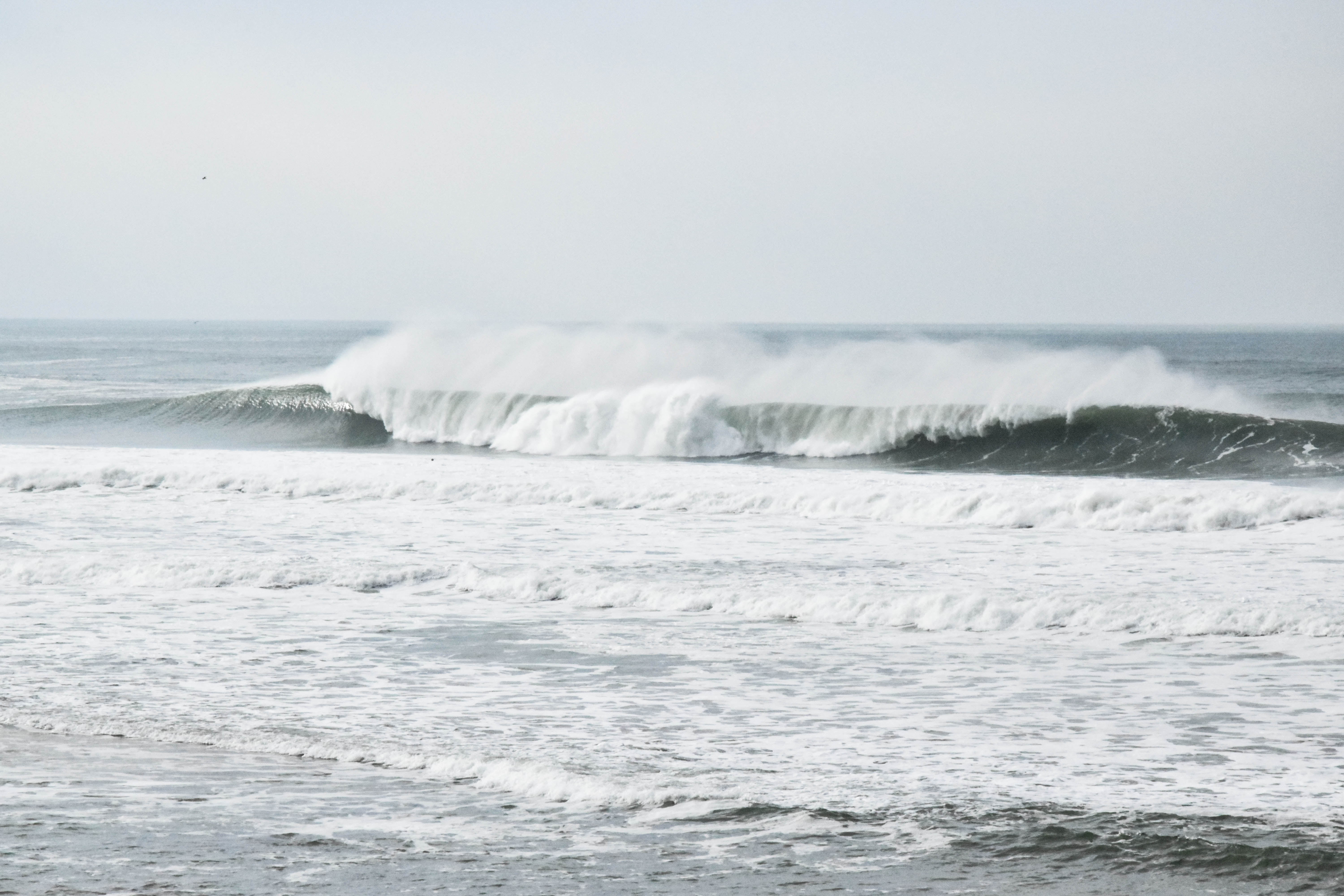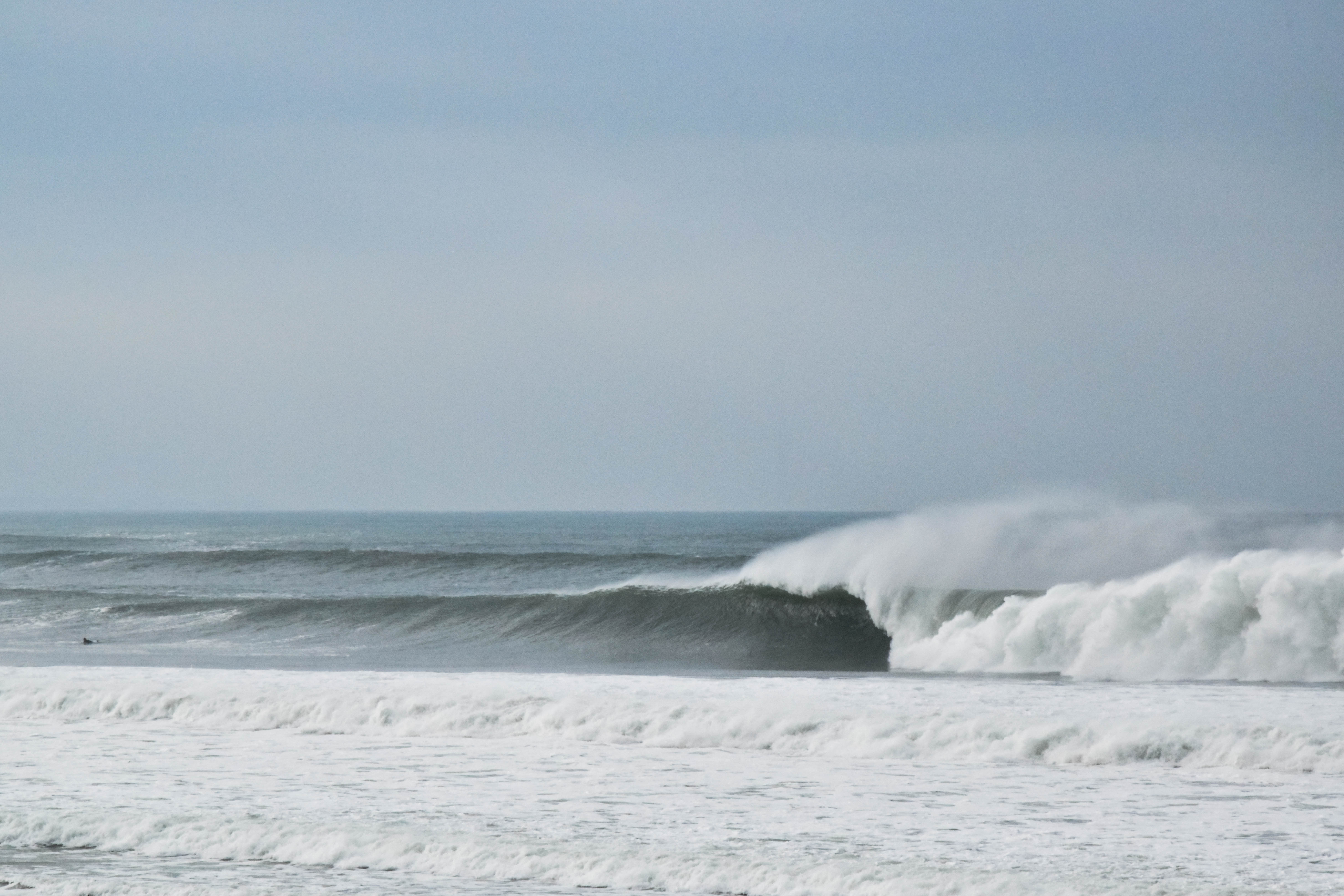 La deuxième plus belle journée de surf est prévue ce jour. Arrivée à 8h45 sur zone, le ciel est plus lumineux qu'hier et le soleil tente déjà de percer, les températures demeurent encore glaciales ce matin. Le vent est off-shore modéré à mon arrivée et la longue houle est là. Des vagues moyennes d'1m80 à 2m déferlent sur les plages et des bons gros sets à 2m-2m50 surgissent toutes les 5 à 7 minutes car les grosses séries mettent une nouvelle fois du temps à rentrer. C'est très solide à l'eau sur la marée basse, les vagues sont creuses et rapides, il faut être pro et gros chargeur ou s'élancer en jets-ski pour pouvoir rider les tubes monstrueux qui s'enchainent : mais lorsque tu chopes la bombe aujourd'hui, tu scores forcément et tu ne l'oublies pas. Le placement reste une nouvelle fois difficile, la barre est très dure à passer et la chute ne pardonne pas.