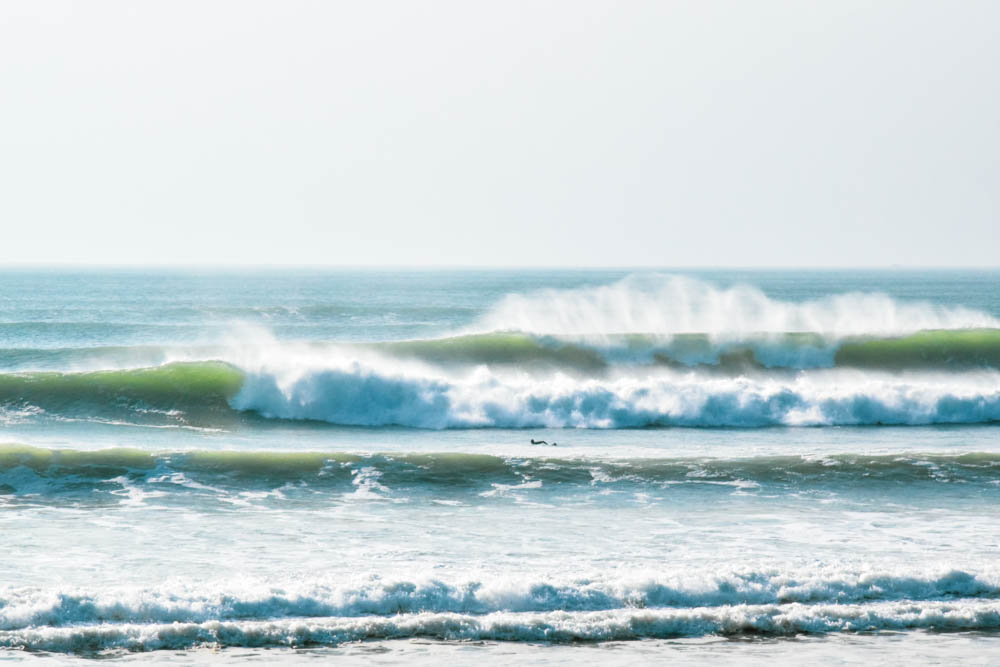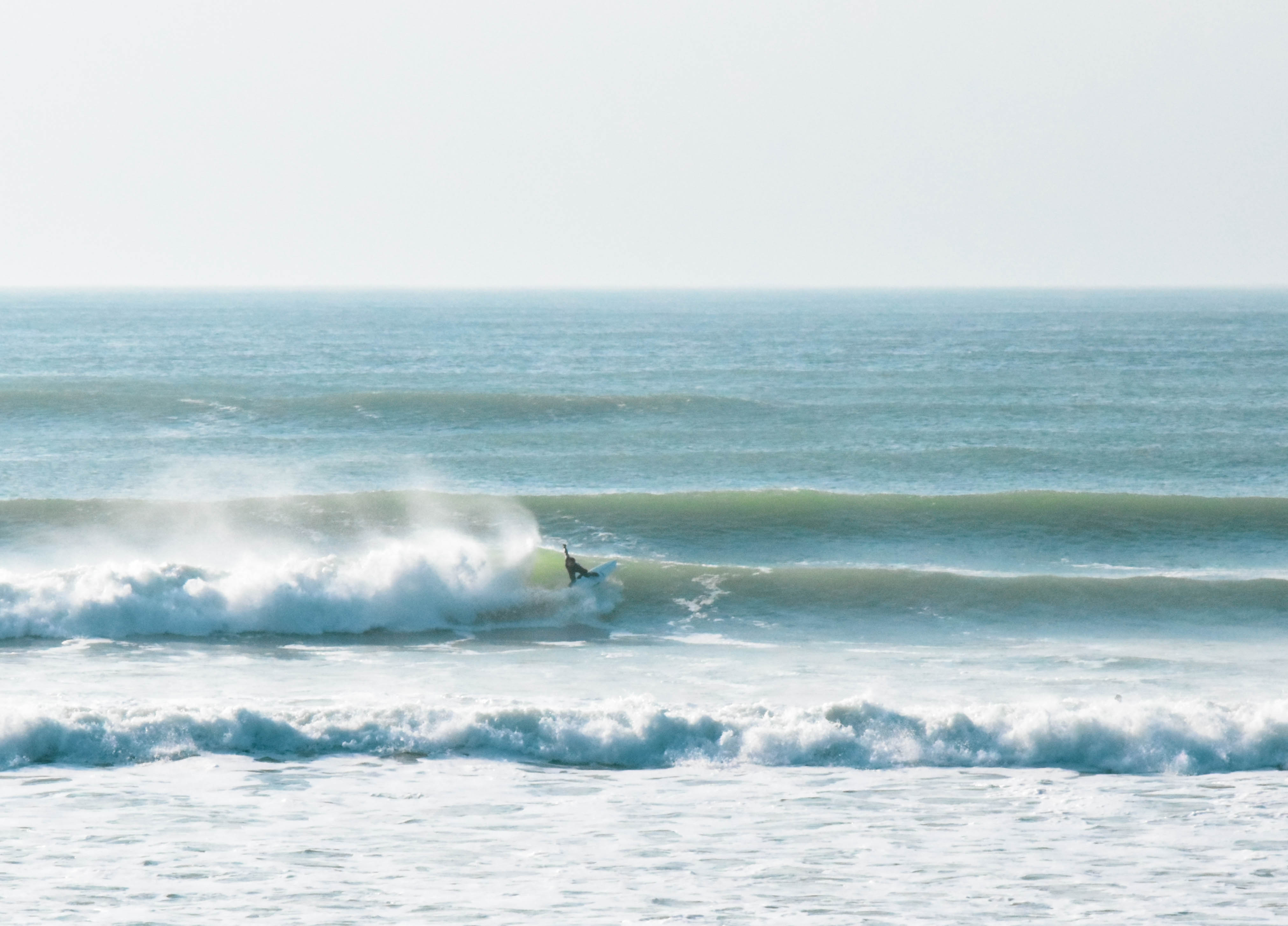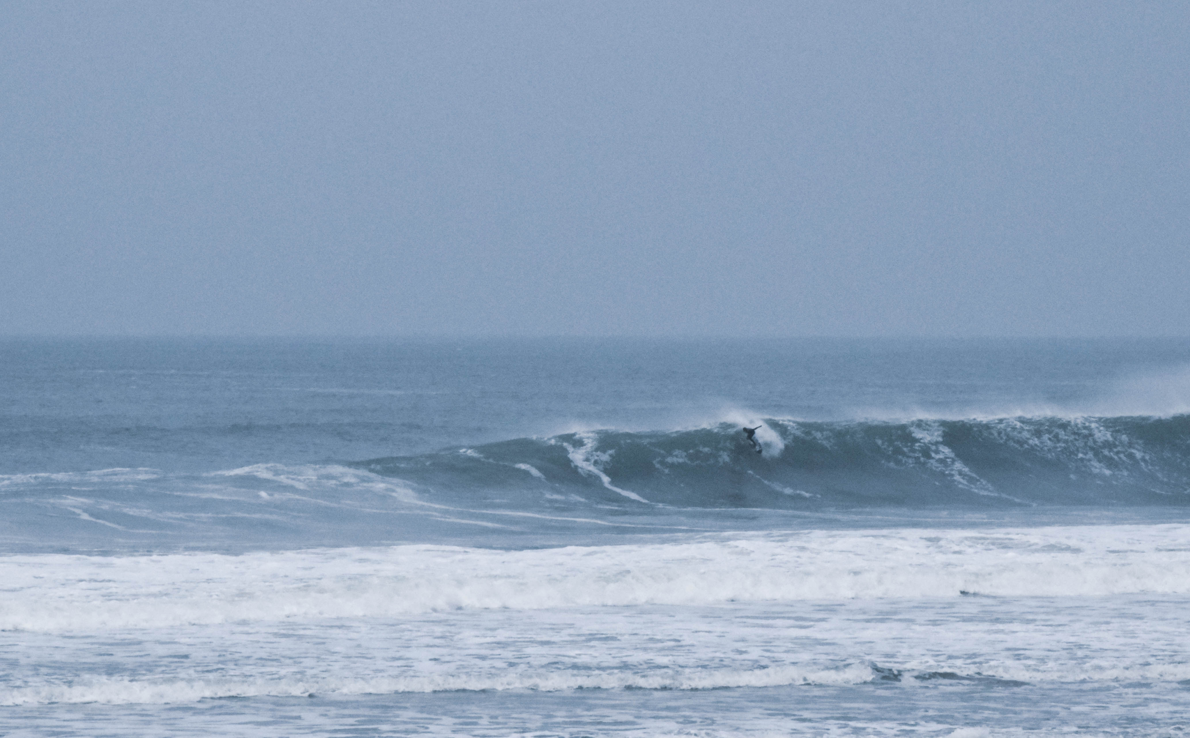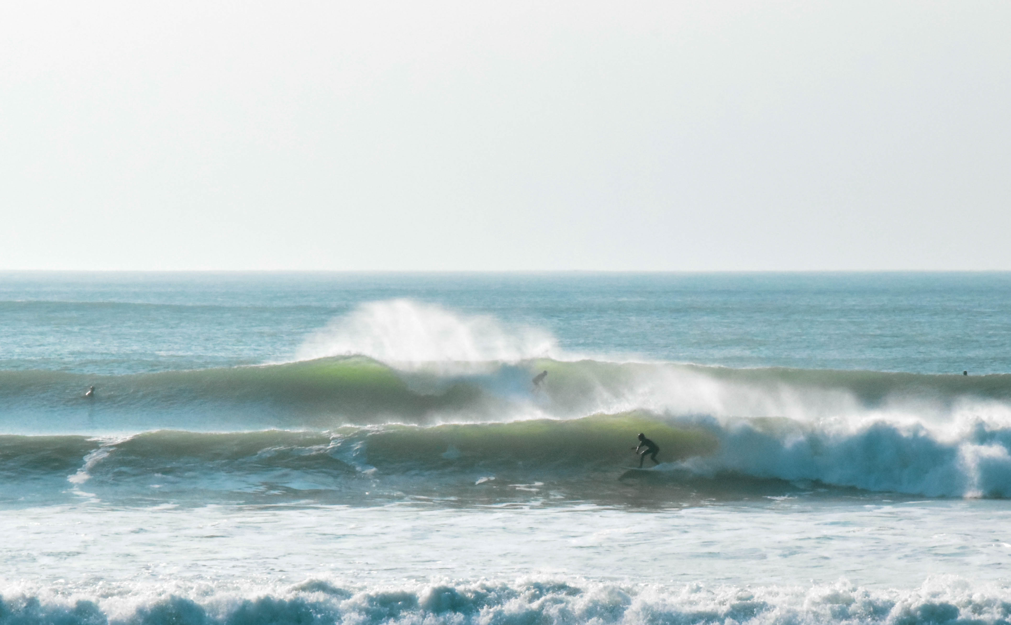 La grosse houle n'est pas encore sur zone mais les vagues ont déjà pris en taille. Le vent est toujours bien établi off-shore au lever du jour sur les spots. L'air est frais, voire déjà froid dehors du fait du vent qui souffle modéré. Quelques surfeurs se sont levés tôt et sont à l'eau à mon arrivée, profitant d'un plan d'eau glassy et de quelques bonnes vagues propres qui ouvrent, en droite comme en gauche, avec 1m20-1m50 sur les plus grosses séries. Mais ce n'est qu'un échauffement car le meilleur reste à venir.