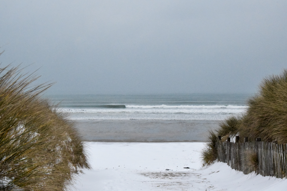 C'est une journée d'accalmie car la houle s'est légèrement amortie, mais de façon temporaire : les grosses conditions sont attendues pour le lendemain. Le froid lui n'a pas plié bagage, bien au contraire : le ressenti est saisissant et vivifiant, le Morbihan grelote encore un peu plus. Et personne ne l'avait réellement vu venir ce jour-là, mais la neige a de nouveau fait son apparition dans la matinée, et pas qu'un peu : en effet, les chutes de neige ont débuté vers 8h45 et les gros flocons n'ont pas arrêté de tomber jusqu'à la fin de la matinée, rendant ici les paysages féeriques et irréels même, tant ce phénomène est rare dans la région. Quelques vaillants bretons ont bravé ces conditions extrêmes pour s'offrir quelques bonnes vagues propres et ouvrantes.