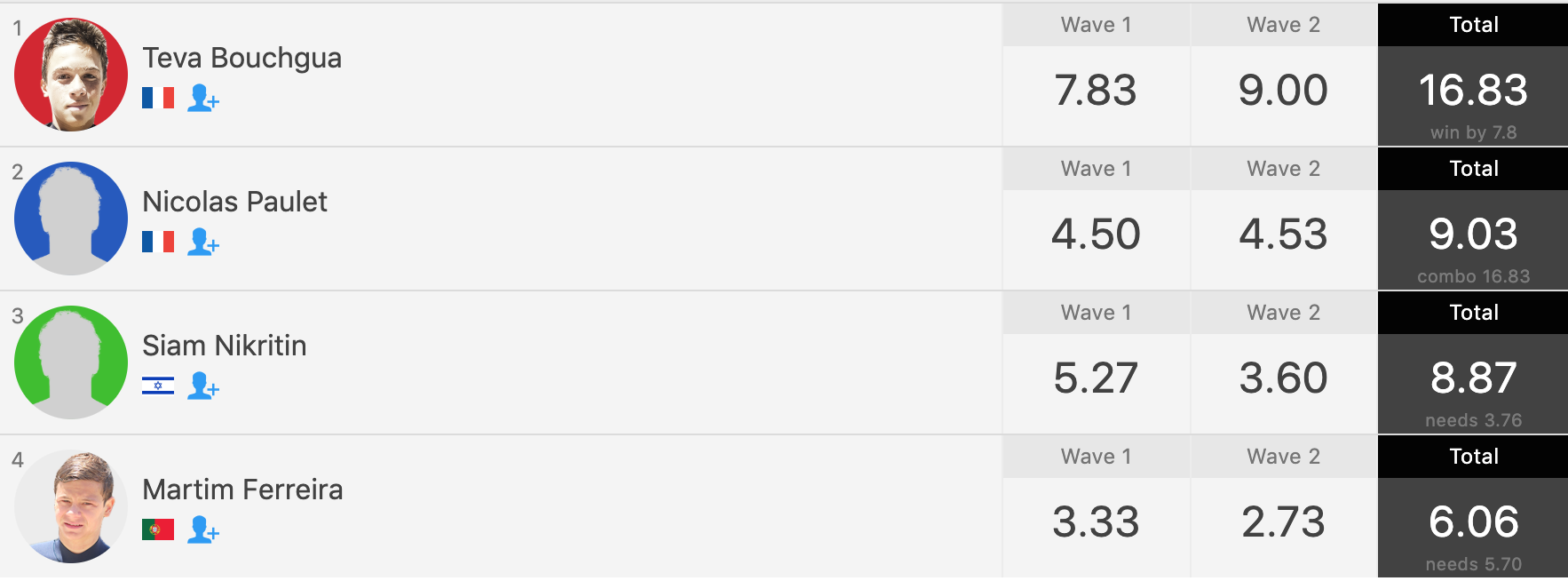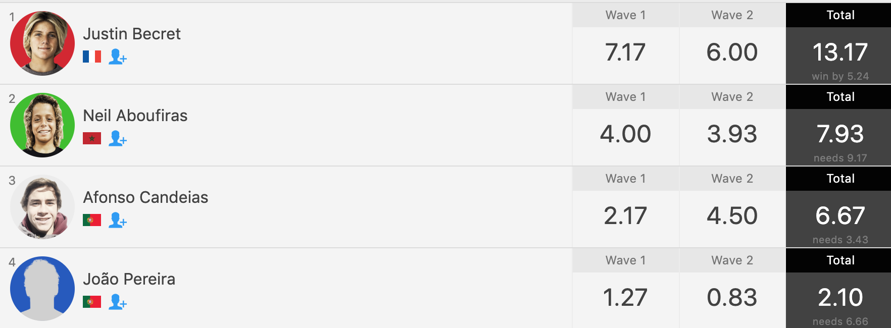 En round 3, Neil Aboufiras réussit l'essentiel en récupérant la deuxième place avec un total de 7.93 points via deux vagues à 4.00 & 3.93 points.