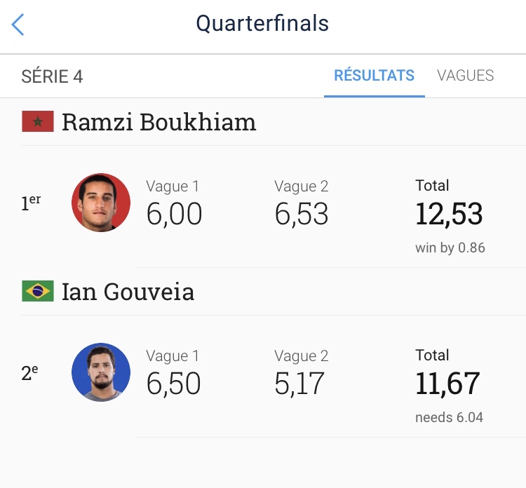 La fierté du Royaume, Ramzi Boukhiam, a été juste inatteignable durant cette compétition ! Il remporte son premier tour avec aisance contre trois brésiliens et finit avec un total de 12,43 points. En deuxième tour, il passe en deuxième position contre Noe Mar McGonagle, avec un total de 11,94 points et élimine le français Marc Lacomar et le brésilien Pedro Neves. 3ème tour pareil, il passe en deuxième position contre le brésilien Ian Gouveia et élimine le Hawaiien Mason Ho.