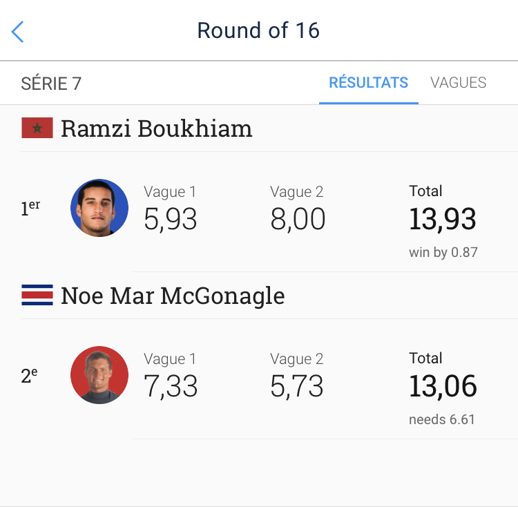 À partir du Round 16, L'heure de la revanche sonna pour Ramzi Boukhiam ! Il commence tout d'abord par éliminer Noe Mar McGonagle lors du un contre un à la toute dernière minute avec sa meilleure vague de la compétition de 8,00 points pour finir en tête avec un score total de 13,93 points.