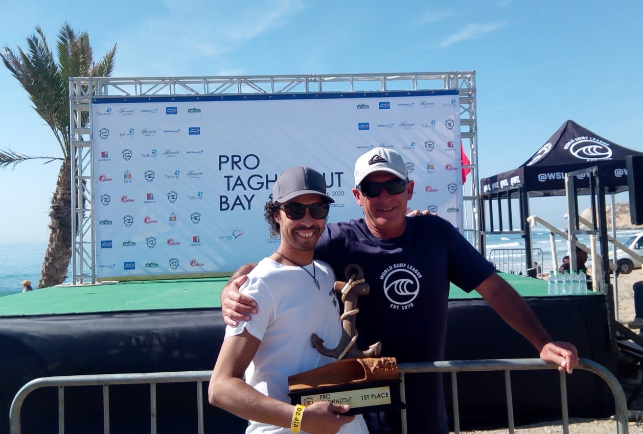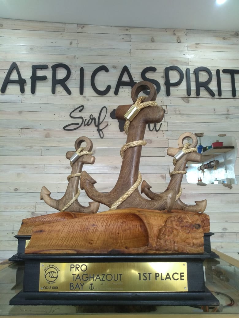 L'ouverture du Shop a coïncidé avec l'organisation du plus gros QS jamais organisé au Maroc, Le Pro Taghazout Bay ! Après de longs échanges avec le directeur de la compétition, Laurent Miramon, nous sommes sortis avec ce résultat en nous inspirant principalement du nom du spot de l'évènement, La pointe des ancres. Le trophée est constitué d'une vague droite sculpter en bois du thuya et l'ancre en bois du noyer la thuya qui pousse uniquement au Sud du Maroc.