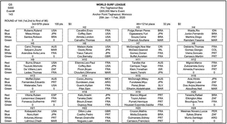 Le premier tour, pas moins de sept représentants Marocains entreront en lice et feront face à certain des meilleurs compétiteurs du QS tels que NoeMar McGonagle(CRI), Kade Matson (USA), Hiroto Arai (JPN), Rafael Teixeira(BRA) et Kei Kobayashi (USA).Les têtes de série quant à elles, sont d'ores-et-déjà qualifiées pour le second tour et commenceront la compétition plus tard. Parmi ces surfeurs, neuf sont qualifiés en 2020 ou d'anciens pensionnaires du Championship Tour (CT), la division d'élite de la WSL.