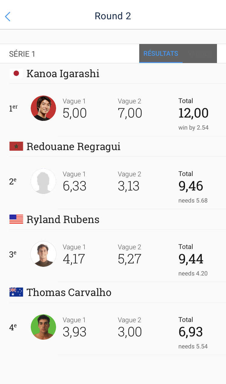 « Je surfe ici quasiment tout les jours donc j'ai réussi à ne pas trop stresser et appliquer la stratégie que je m'étais fixé. Kanoa c'est comme une idole pour moi, je regarde toutes ses vidéos et ses séries sur le CT donc forcément je suis hyper content d'avoir eu la chance de surfer contre lui en compétition. C'est génial de voir tout les pro surfeurs cette semaine, j'apprends énormément en regardant ce qu'ils font et je suis sûr que cela va me faire progresser d'avantage. » Reprend Regragui avec toute modestie mais surtout avec grande détermination d'aller jusqu'au bout dans cette aventure.