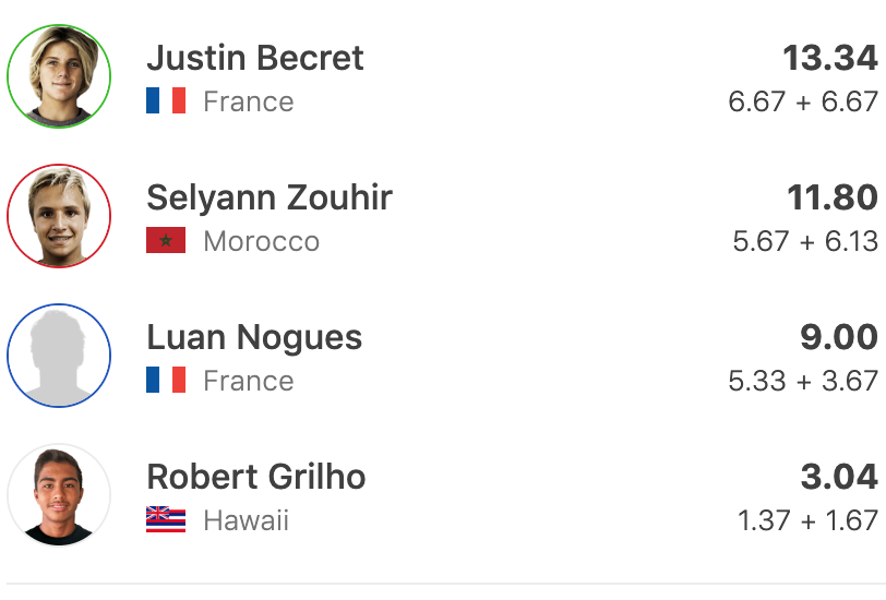 Après un round 3 réussi , Selyann Zouhir entame le round 4 avec beaucoup de confiance en scorant sa première vague à 5.67 puis une autre à 6.13 pour un total de 11.80 points derrière le Français Justin Becret qui a totaliser 13.34 points sur ses deux vagues.