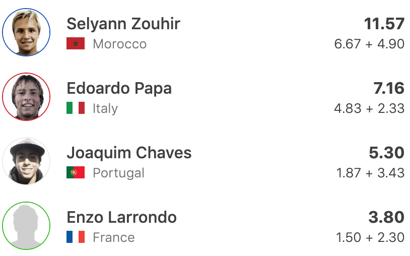 En round 3, Selyann commit une interférence sur la vague de Rodrigo Lebre qui a fini par casser sa planche. Cette interférence coute au jeune Marocain l'annulation de sa vague ainsi que l'annulation de sa deuxième vague, face à ce dilemme Selyann Zouhir savait qu'il avait droit aux points d'une seule vague. Selyann prend une longue droite où il négocie plusieurs turns et récupère 6.83 points qui était a elle seule capable de le mettre à la première place de la série!