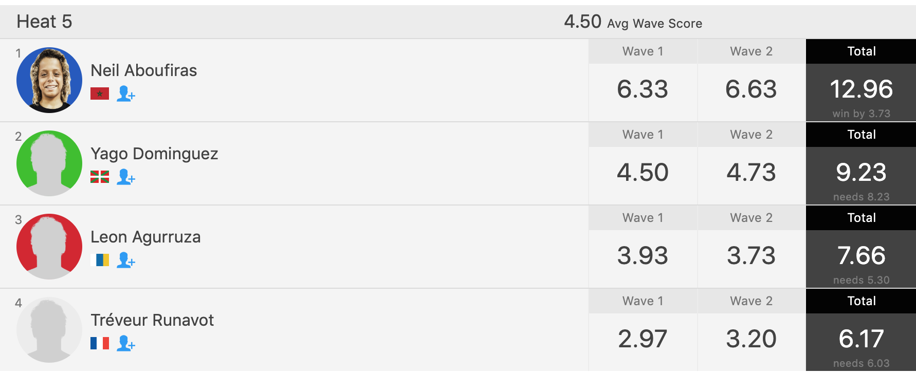 Neil Aboufiras qui démarrait cette compétition du Round 2, a scoré le meilleur combo lors de ce round avec une première vague à 6.33 et une deuxième 6.63 pour un total de 12.96 points . Neil remporte sa première série de cette compétition et rencontrera les Top-seeders lors du round 3.