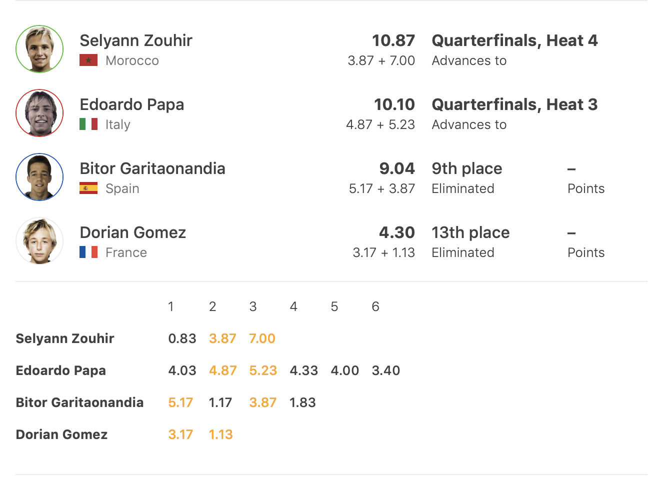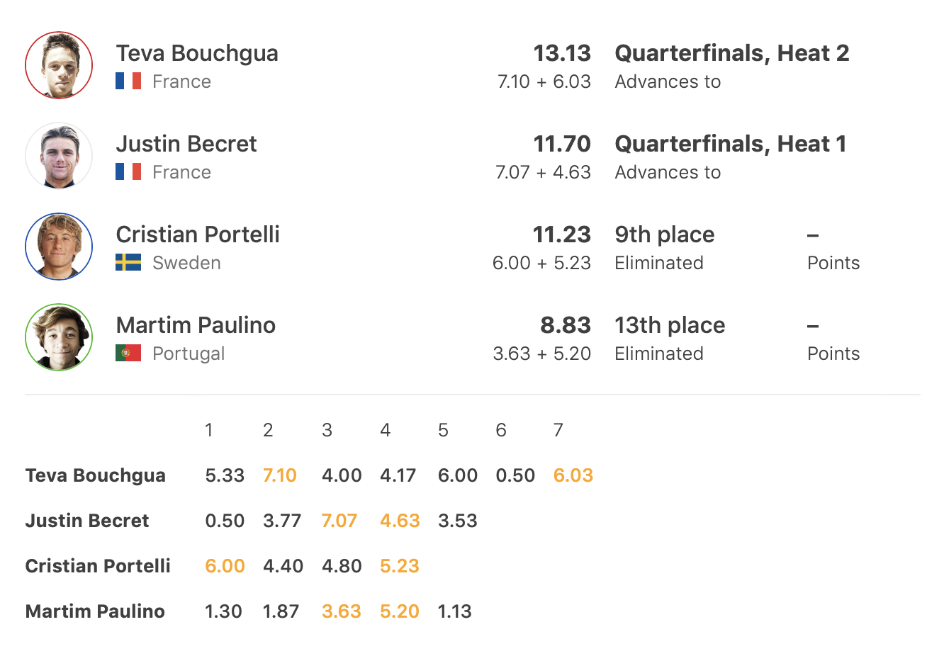 De son côté Selyann Zouhir a encore démontré un mental solide en scorant une vague à 7 points dans les dernières minutes du heat pour accrocher une qualification en quart de final.