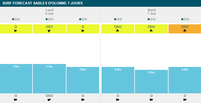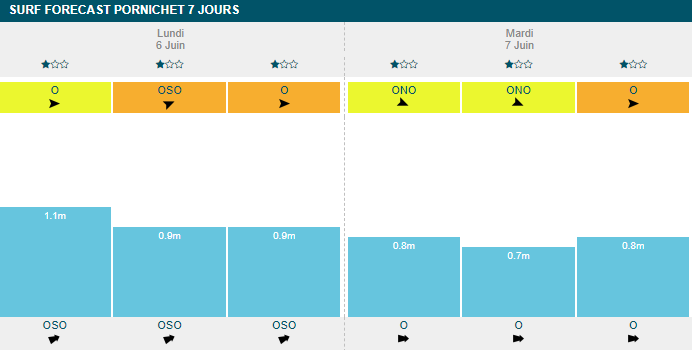 En Vendée, la houle d'ouest entrera de façon contrôlée. Si la semaine commence tranquillement (70 cm ce matin), les vagues prendront en taille au fil des jours pour atteindre 1m70 mercredi. Attention ce jour-là aux rafales de vent onshore à plus de 20 km/h qui pourraient fortement gêner le plan d'eau.
