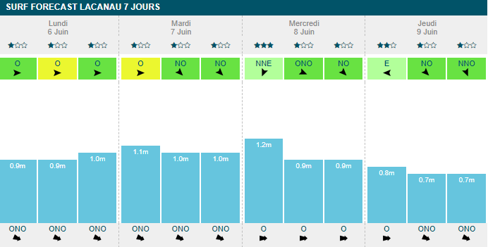 La journée de samedi sera particulièrement à surveiller, la période atteignant les 15s dès samedi matin il sera possible de voir de jolies lignes se former (vent side-shore à 7km/h sur le créneau).