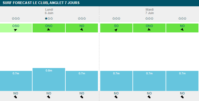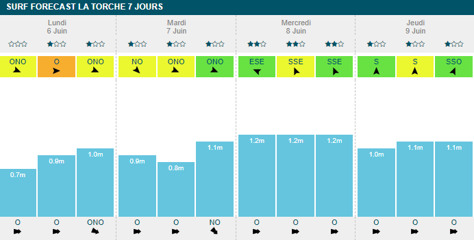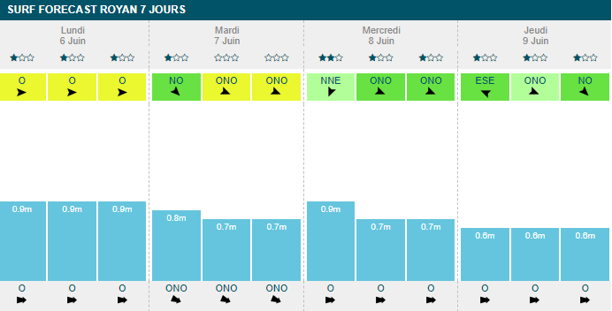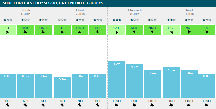 Le week-end devrait connaître une hausse significative de la houle, qui atteindra les 2m10 samedi dans la matinée. Le vent toujours sous les 10 km/h ne devrait pas avoir trop d'impact sur le plan d'eau, alors que la période à 15s promet une belle intensité à l'eau.