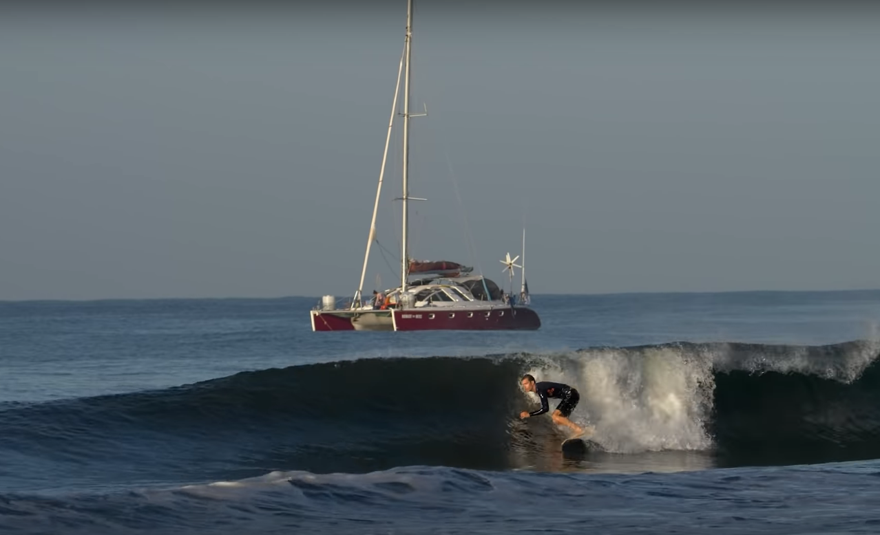 Pour cela, Corentin de Chatelperon, l'initiateur du "Low Tech Lab", leur a proposé de venir suivre une formation à bord de sa plateforme expérimentale. Cela fait 5 ans maintenant que Corentin a quitté les pontons de Concarneau dans le Finistère pour réaliser un tout du monde dans le but de partir à la rencontre d'autres inventeurs de low tech, développer de nouveaux systèmes et les promouvoir auprès du plus grand nombre. L'hiver dernier, les trois surfeurs explorateurs bretons ont ainsi rejoint Corentin et sa co-naviguatrice Caroline au nord de l'Amérique Centrale.