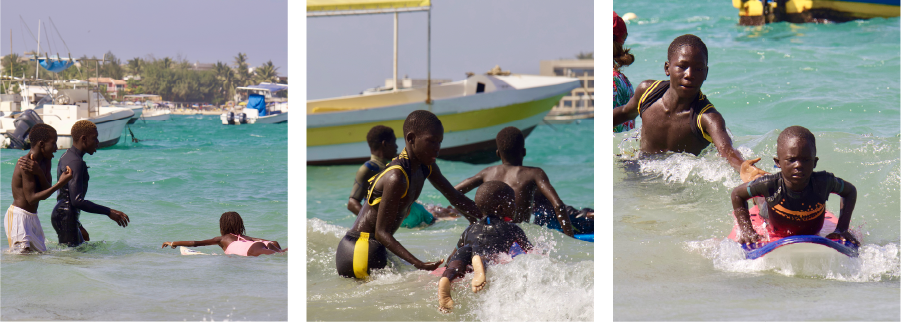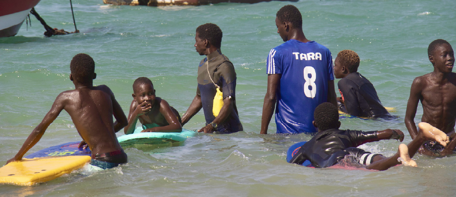 La session de surf avec les jeunes de Pape se déroule le dimanche sur la plage de Ngor. Entre les bateaux qui font la navette jusqu'à l'ile, il y a des petites vagues de bords, idéales pour quelques poussettes de débutants. Le cours démarre très vite, une quinzaine de gamins arrivent de toutes parts, des moussus ou de vieilles shortboards sous le bras. Les deux groupes d'élèves se relaient dans l'eau, ils ont l'habitude. Les plus grands, déjà surfeurs, s'occupent de pousser les plus jeunes et de les guider.