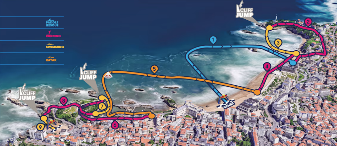 "Le principe ? Cinq sports regroupés sur une seule et même course folle. Le cadre ? Les plages mythiques et l'océan démonté de Biarritz, berceau de la discipline en France. Les participants ? 16 hommes et 6 femmes - parmi les meilleurs athlètes de la discipline - qui devront courir, nager, sauter et pagayer (en kayak et en planche) entre différents points sur un parcours de plus de 5km."