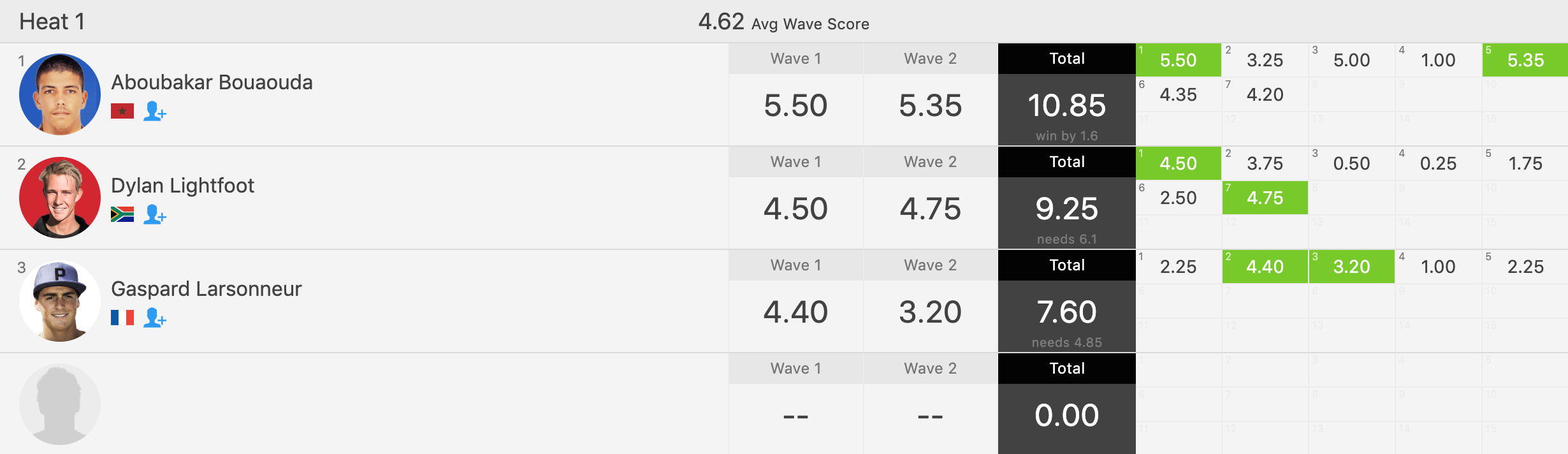 Le surfeur Aboubakar Bouaouda est le seul représentant du Maroc lors de cette première édition du QS sénégalais. Aboubakar a débuter le premier round de ce premier QS sénégalais face au sud-africain Lightfoot Dylan et le Français Larsonneu Gaspard. le très prometteur Bouaouda n'a pas attendu longtemps pour prendre la première position du heat en scorant une vague de 5.50 points qui restera la vague la mieux notée du heat. Le jeune surfeur Marocain au talent indéniable a assuré sa place en round 2 en scorant une vague de 5.35 points pour un total de 10.85 points.