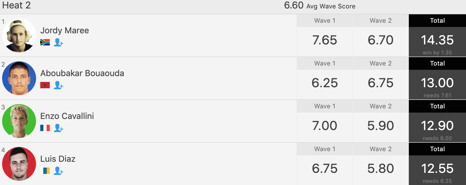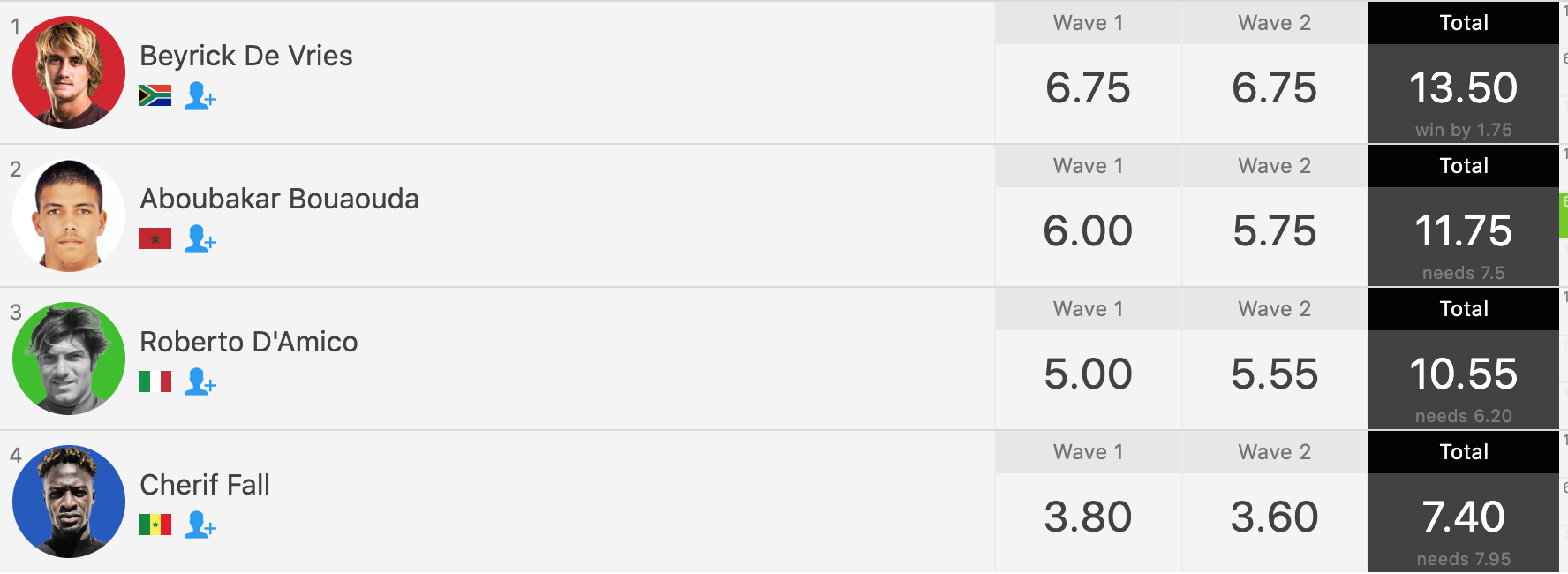 Après un premier round réussi. Aboubakar devait affronter en round 2 le sud-africain Beyrick De Vries, le champion sénégalais Cherif Fall et l'Italien Roberto D'Amico. un round difficile que le jeune champion marocain a su gérer en scorant une vague de 5.50 puis un backup a 6 points aux dernières instants de la série ce qui lui permet de totaliser 11.75 points et donc de récupérer la deuxième place qualificative au prochain round.