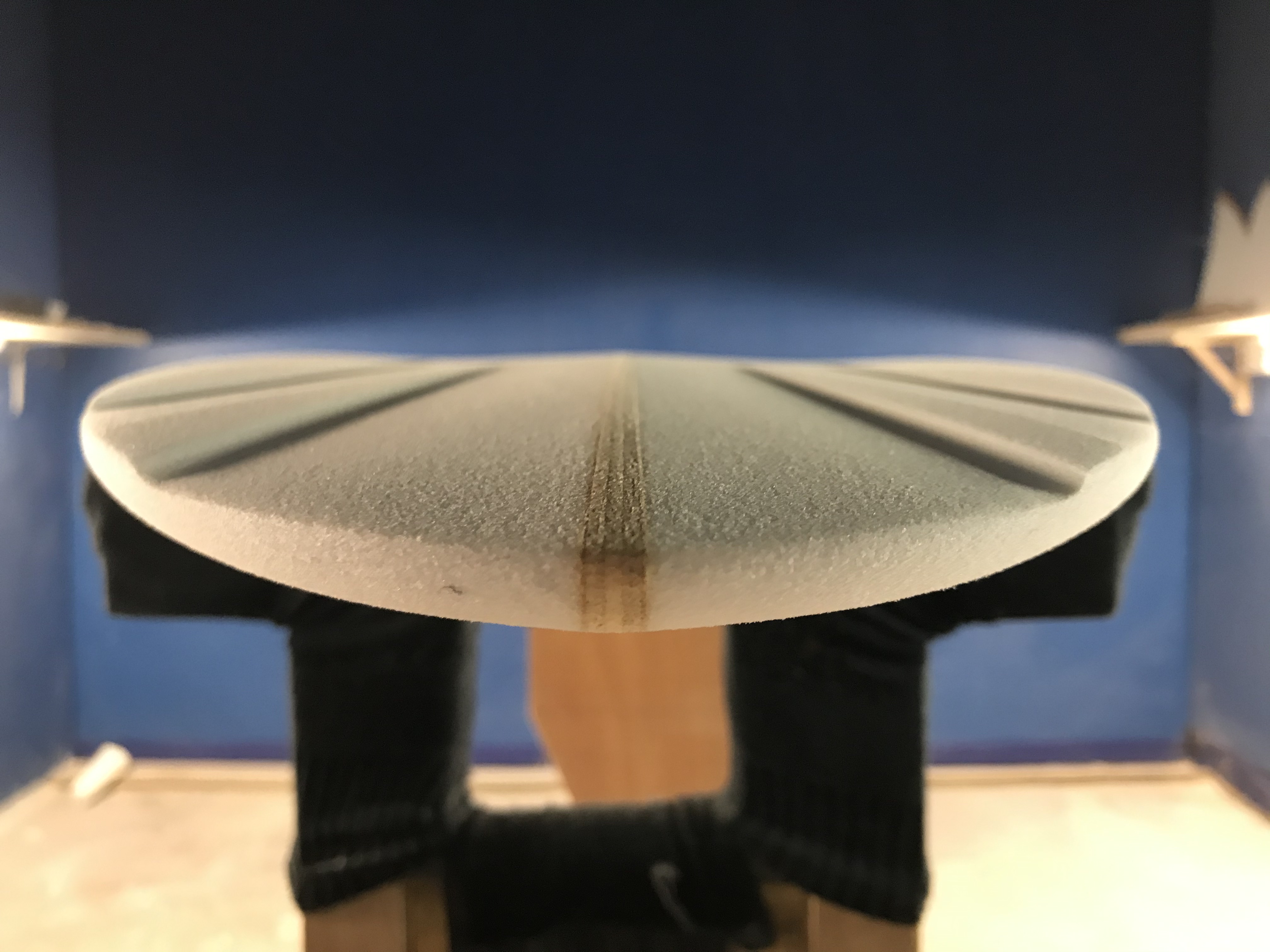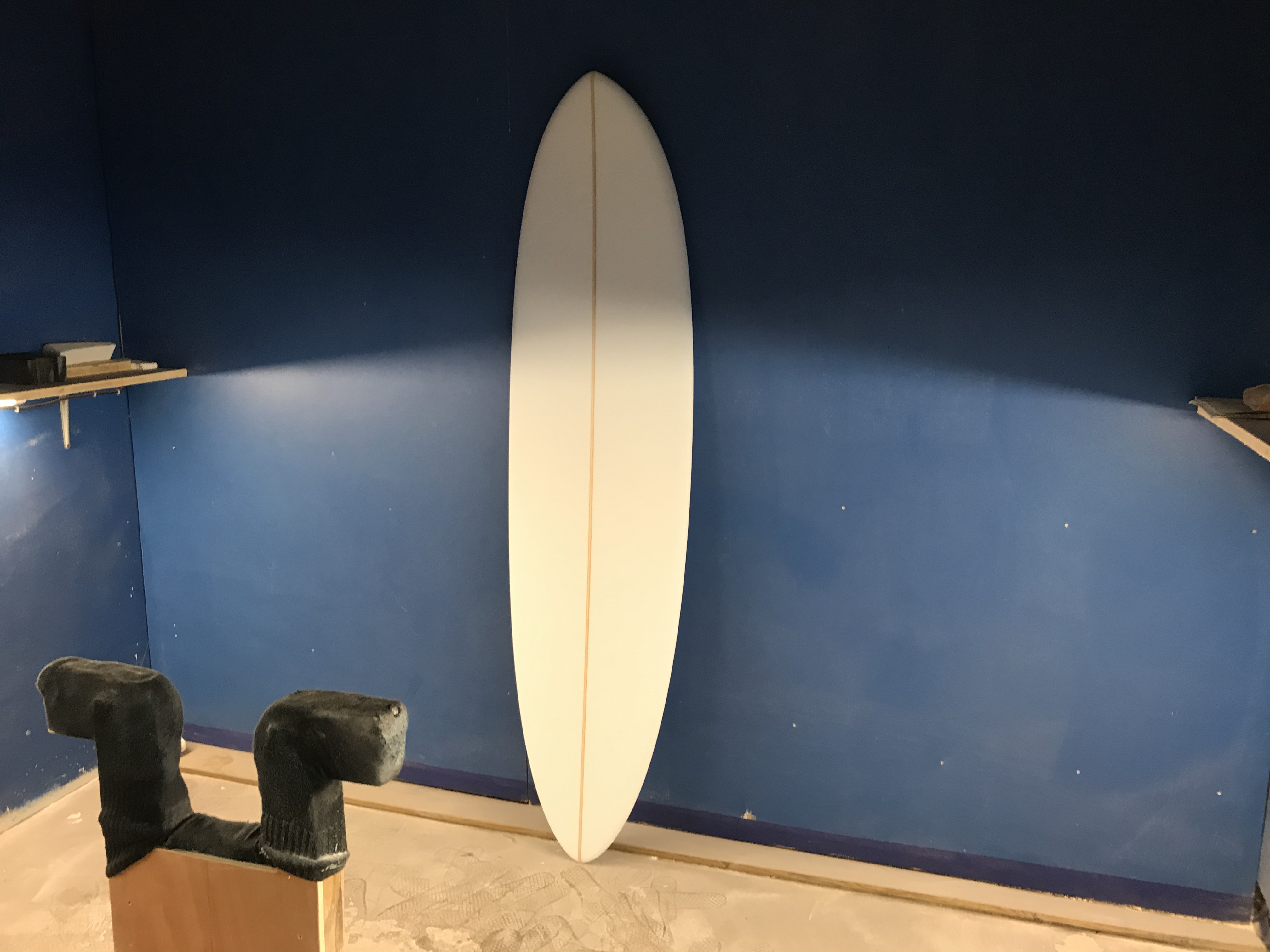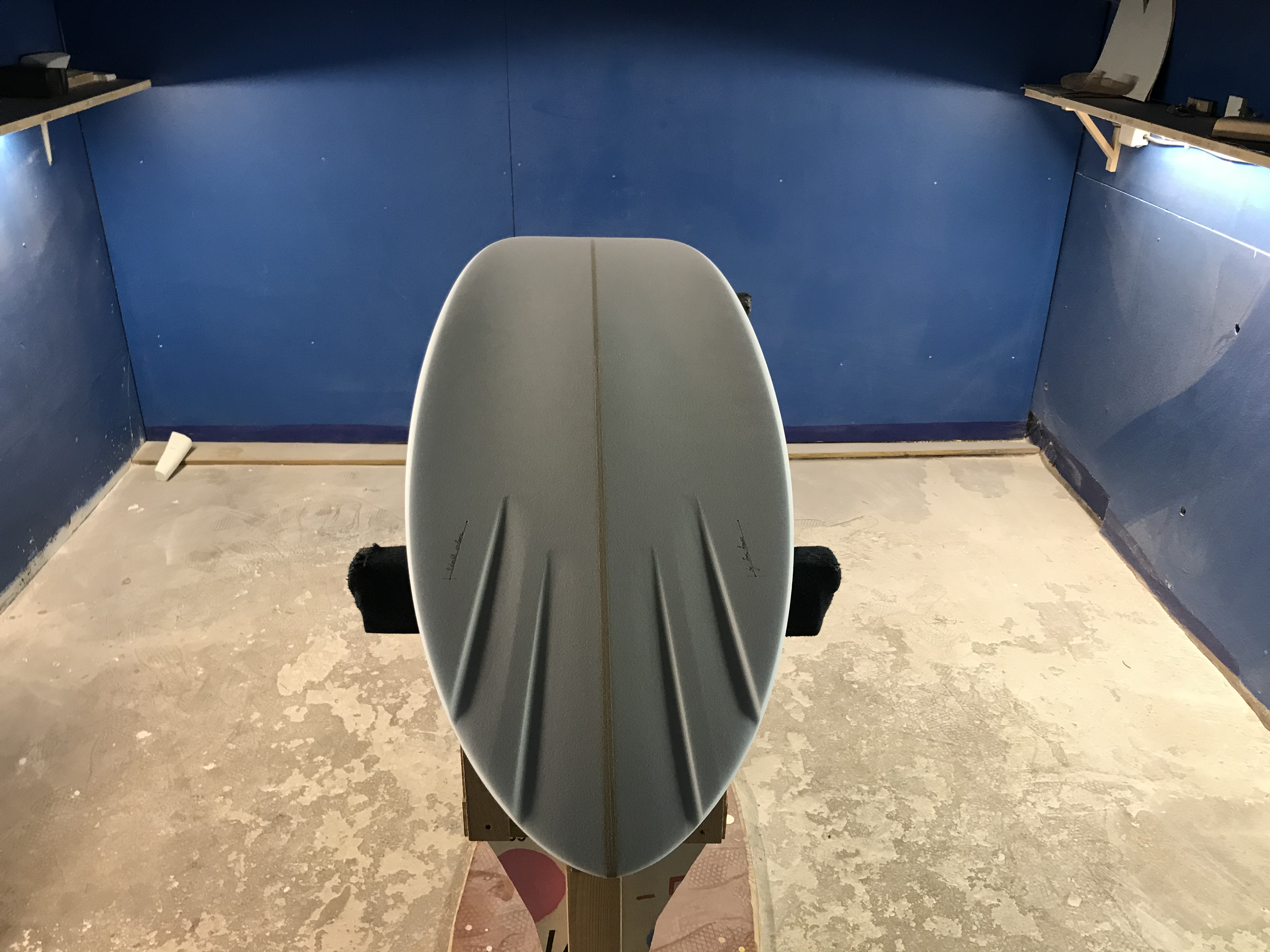 Si le programme de surf va définir globalement le shape, alors je regarde dans nos templates si nous avons un outline tendu qui pourrait se rapprocher de ce concept de Mid Length Twin. Je conserve un peu de volume devant pour que la planche soit performante à la rame et lors de l'entrée en vague, puis je travaille la carène avec un spiral-vee prononcé avant de réaliser des channels prononcés qui permettent de gagner en vitesse. La planche a relativement peu de rocker derrière et se termine en round pin tail pour l'accroche et la facilité de passage rail-to-rail.