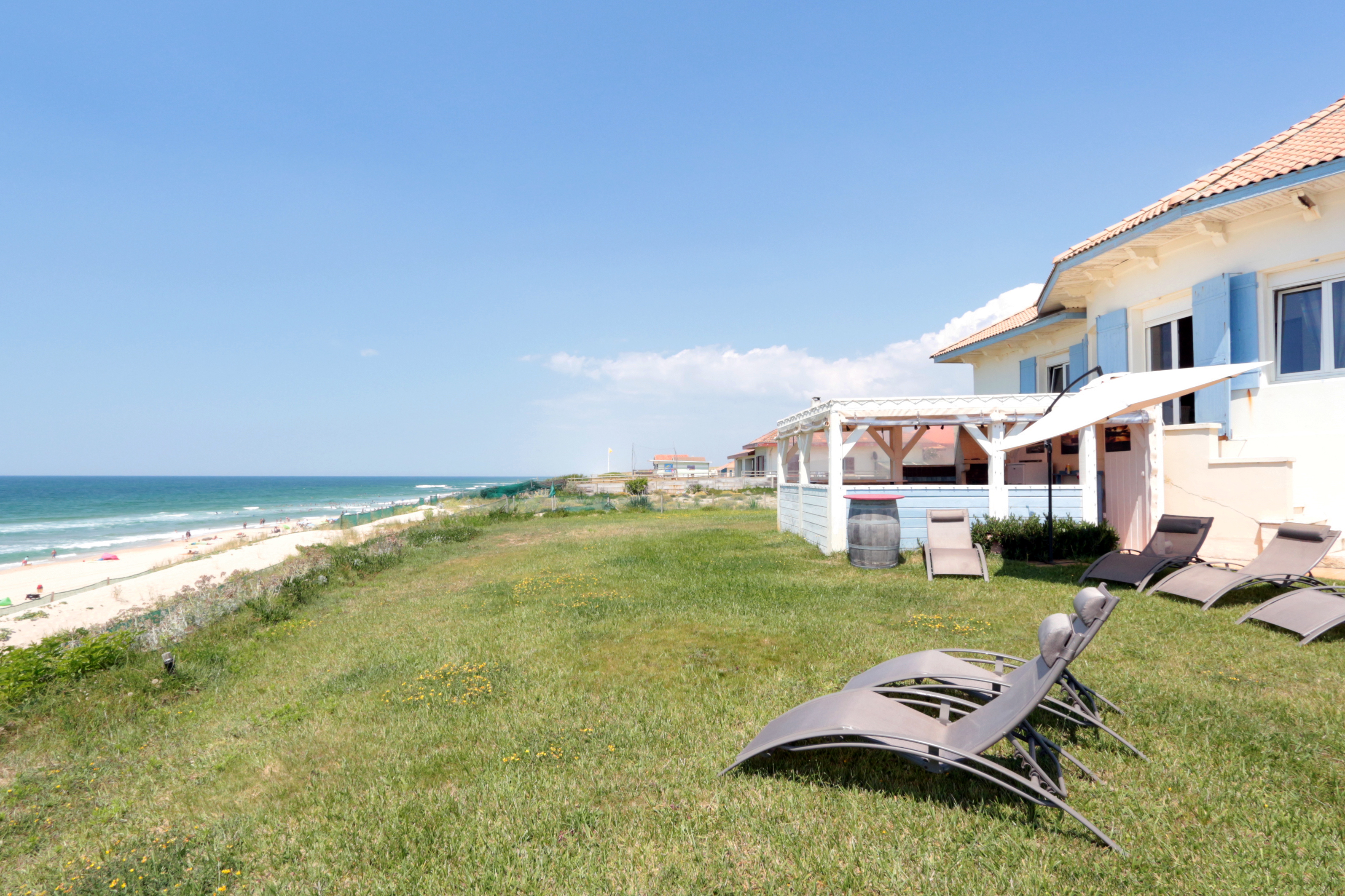 Avec 276 m2 habitables, un accès direct à la plage, une belle pièce à vivre, 8 chambres, 5 salles de bain, et un jardin engazonné face aux vagues avec cuisine d'été, la convivialité est ici une évidence.