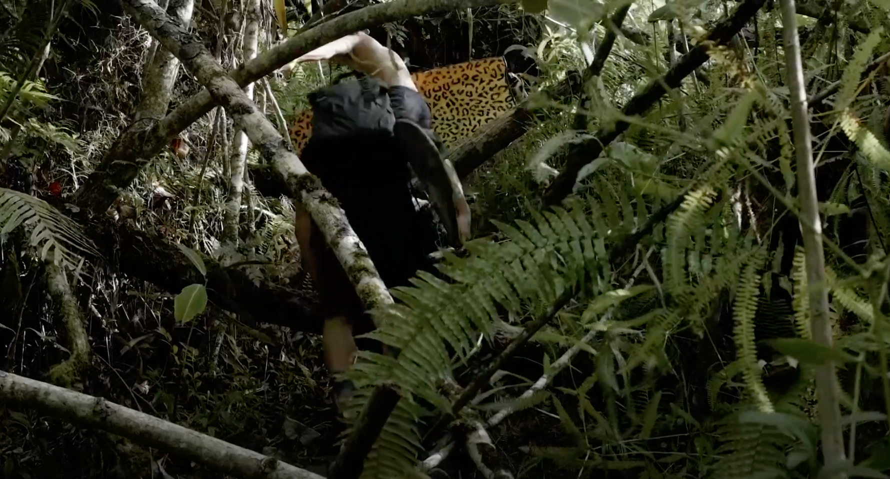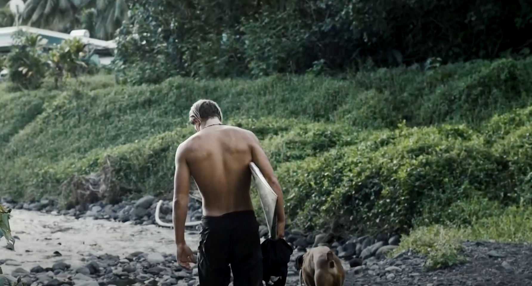 Sur le chemin du retour, entre son homespot et son domicile, le Tahitien accompagné de son frère s'enfonce, planche sous le bras, dans l'épaisseur de la forêt qui se trouve derrière chez lui. À la manière de l'océan, ils font de cette forêt un vaste terrain de jeu où la glisse a tout à fait sa place. Assis ou debout, les deux frères dévalent les pentes touffues avant de se jeter dans l'eau douce d'une rivière. Eimeo y laissera même un pied...