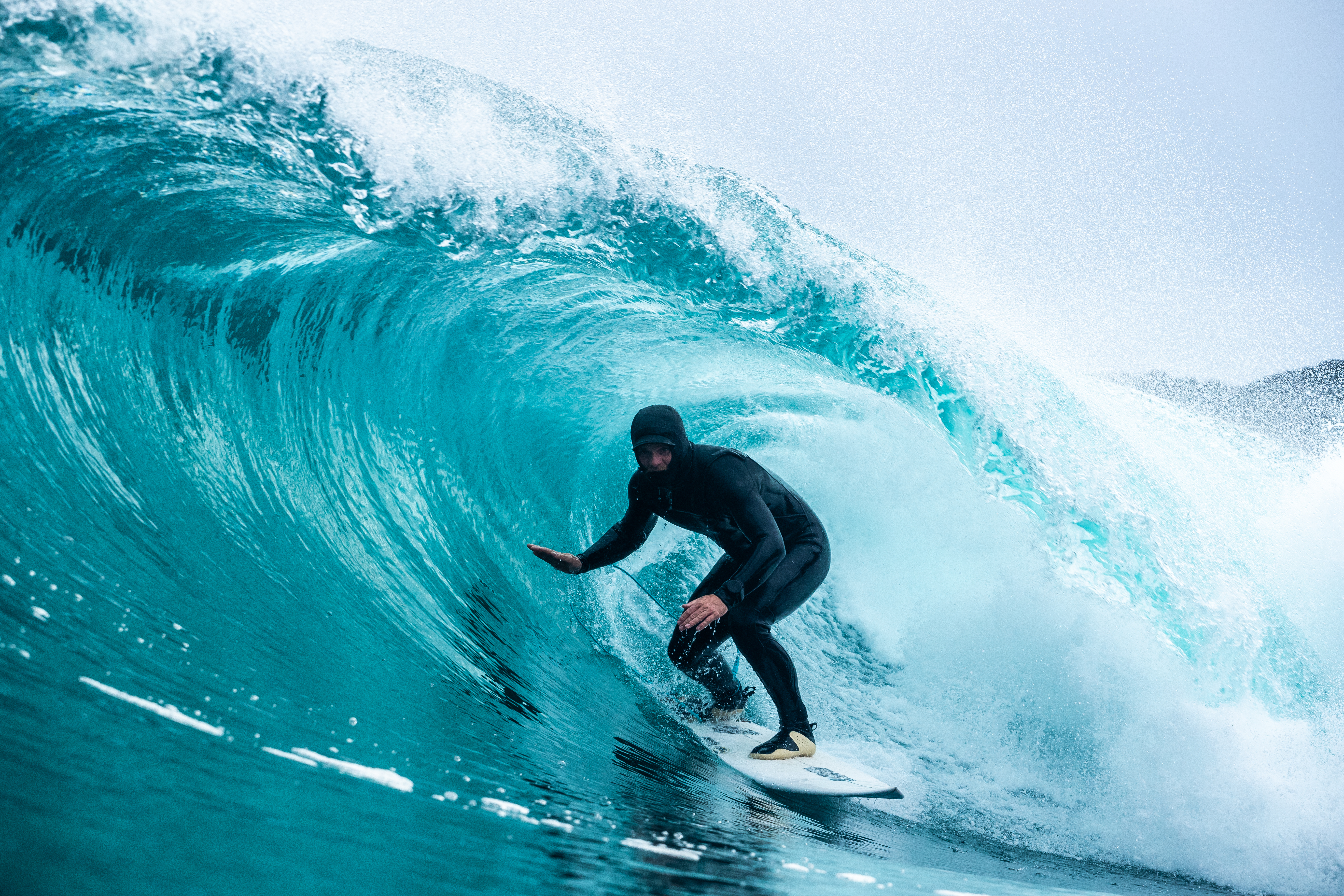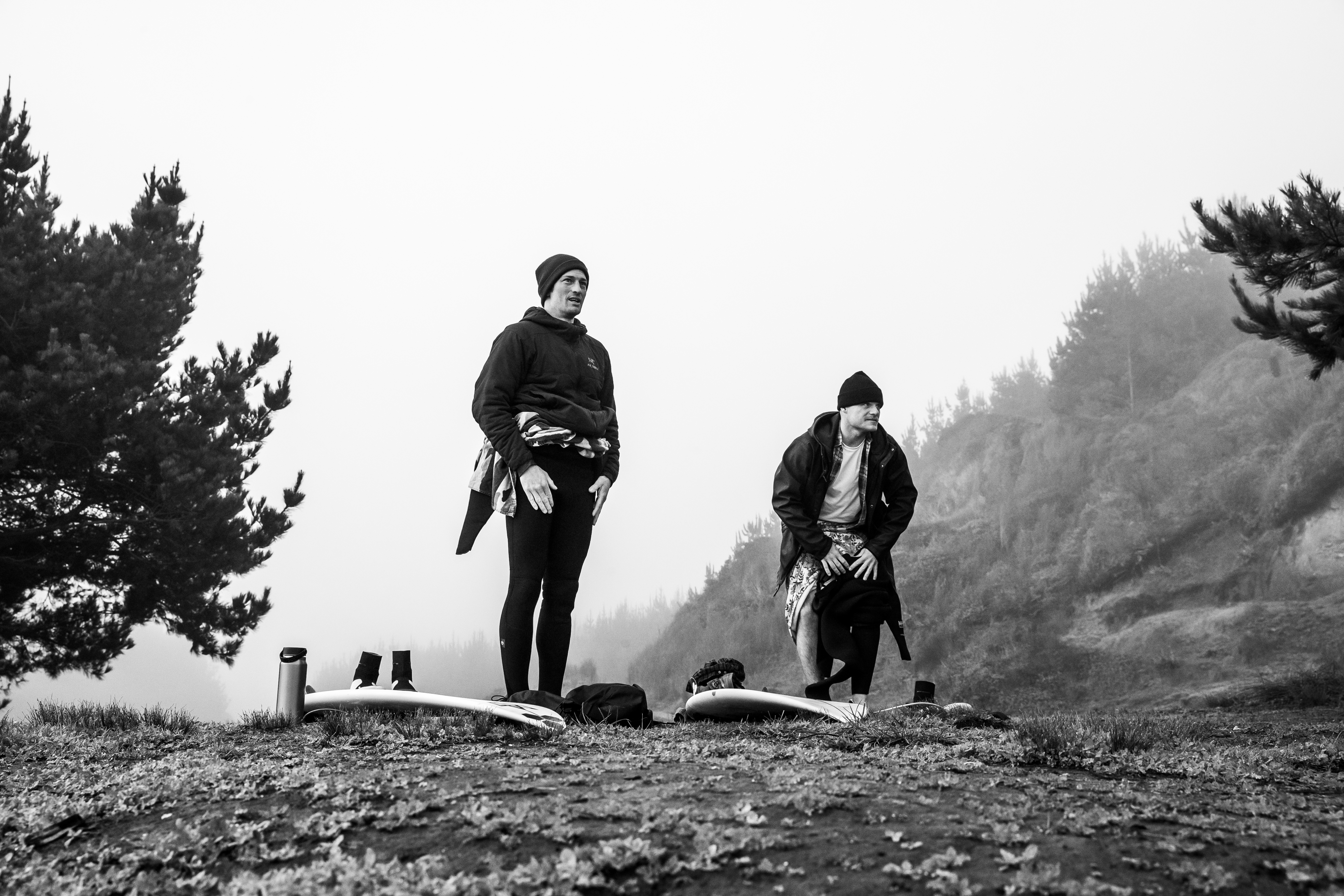 Nous surfons beaucoup, jusqu'à trois sessions par jour en alternant entre nos 6.4mm cagoule le matin, et 5.4.3mm cagoule l'après-midi. L'eau est à 8°C, et la température de l'air varie entre 0°C lors de la première session du matin et 10°C l'après-midi, ce qui est plus que supportable. Nous testons les produits dans toutes les conditions, autant les plus intenses près du bord que celles nécessitant beaucoup de rame sur les points breaks. Je m'attendais à subir plus le froid, mais en fait, quand on est bien équipé, tout va bien. Je suis agréablement surpris de la souplesse d'une 6.4mm cagoule intégrée. Je peux vraiment bien ramer, et je suis très confortable dedans. Je crois que je vais la mettre plus souvent à la maison !