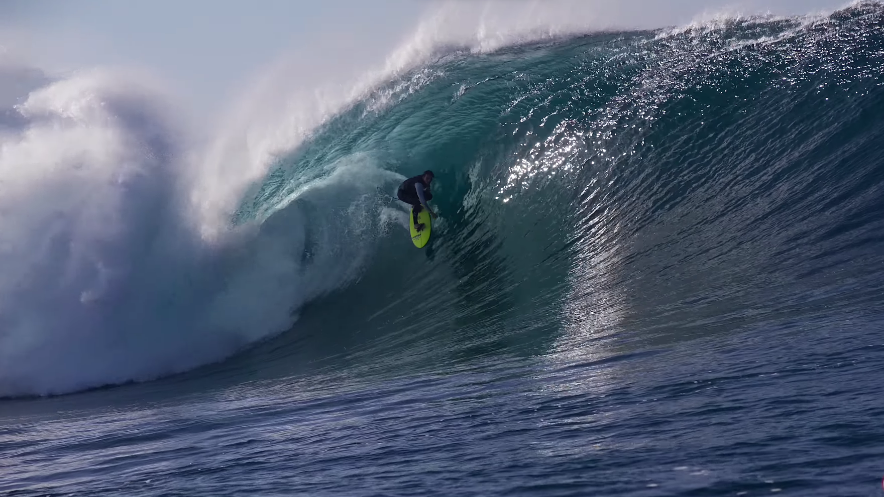 Plus à l'intérieur, des marches énormes se formaient avant d'offrir une section plus lisse. C'est bien pour cela que les surfeurs partaient en tow-in et non pas à la rame, un avantage évident quand on les voit s'élancer. Avoir les pieds strappés sur la board permet de la garder sous les pieds lorsque le air drop est inévitable. Sur plusieurs des vagues que Tim a filmées, on les voit décoller dans les airs ou être enfermés dans le barrel. Un départ tracté par le jet ski leur permet d'aller plus à l'intérieur et de sortir un barrel toujours plus profond. Ils peuvent s'élancer avec un maximum de vitesse et ne pas avoir à faire de take off est essentiel dans une vague aussi creuse.